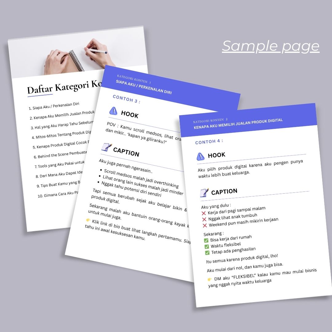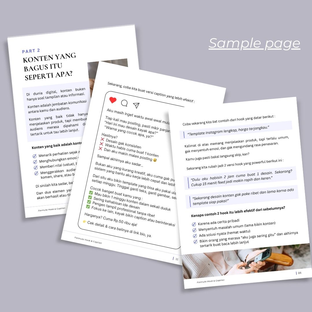 Ebook ini berisi daftar hook & caption yang sudah dikelompokkan berdasarkan kategori konten, siap pakai atau kamu sesuaikan sendiri sesuai gaya bisnismu.