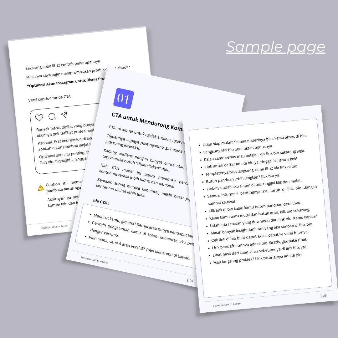Ebook ini berisi panduan memahami fungsi CTA dan daftar 200 ide CTA efektif yang bisa kamu gunakan untuk berbagai tujuan konten, dari bangun interaksi sampai closing.